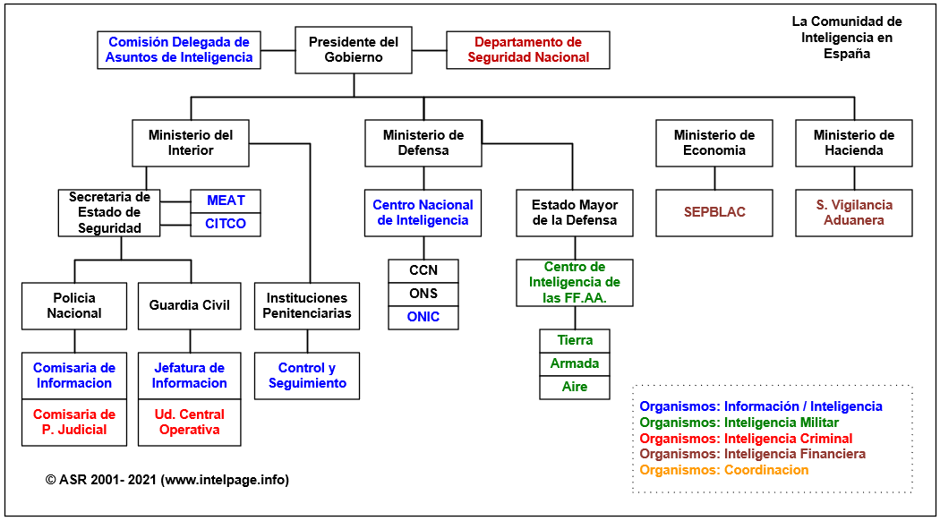 El Conjunto de Organismos dedicados a labores de Información e Inteligencia en España puede agruparse en tres grandes bloques: